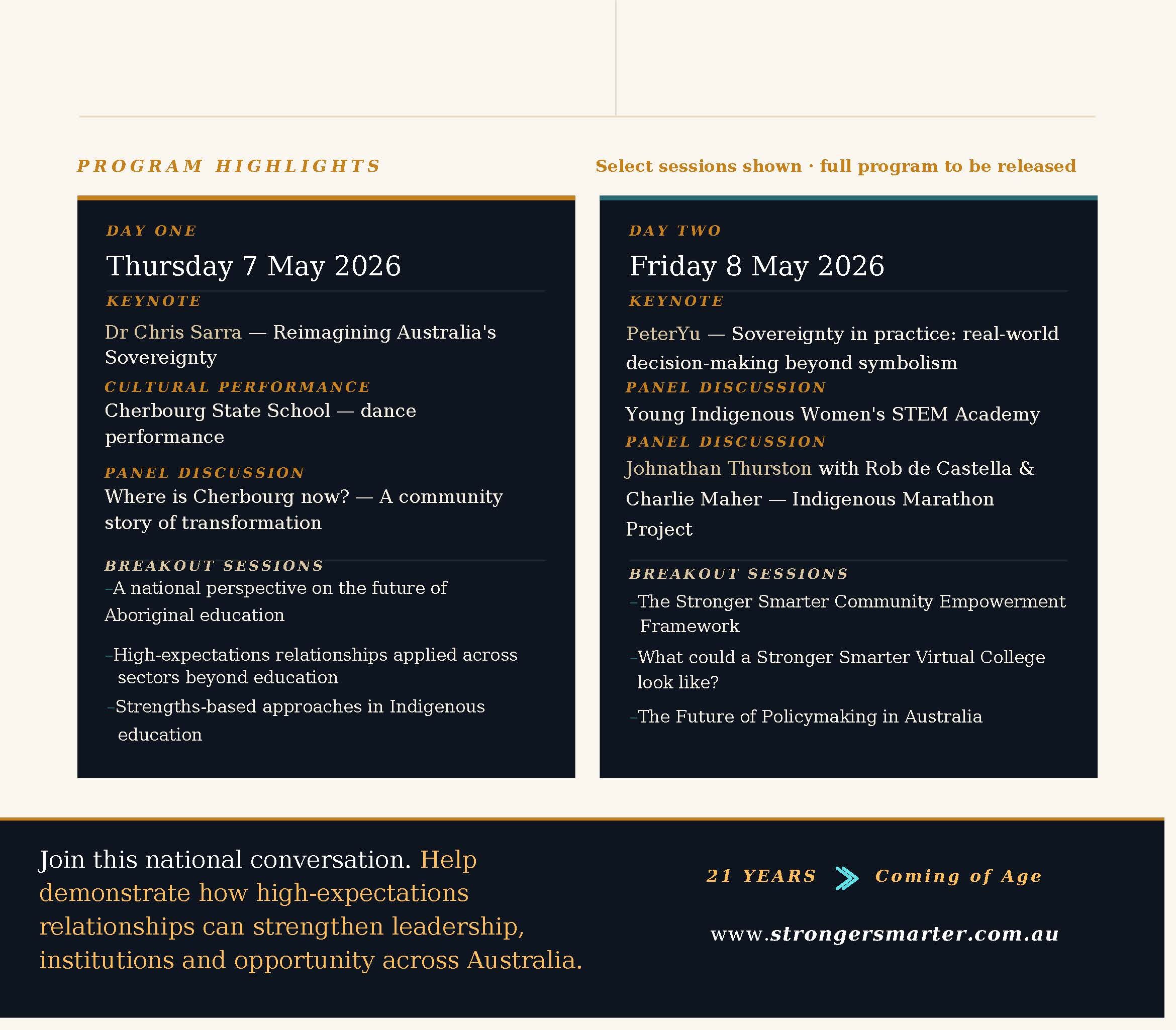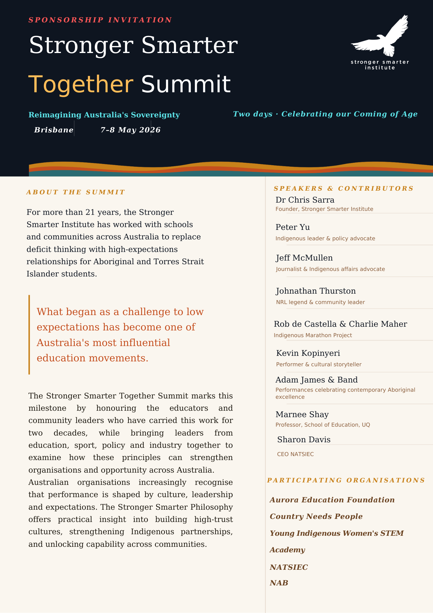 The Stronger Smarter Together Summit marks this milestone by honouring the educators and community leaders who have carried this work for two decades, while bringing leaders from education, sport, policy and industry together to examine how these principles can strengthen organisations and opportunity across Australia.